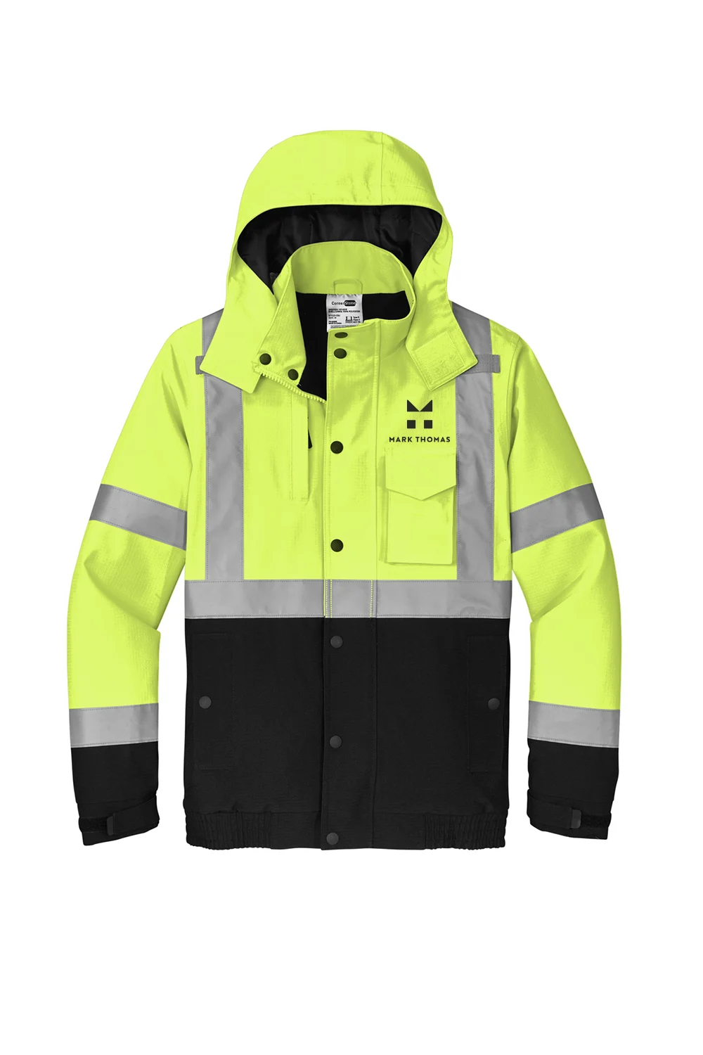 Built for high-performance work sites, this bomber jacket offers exceptional protection, durability, and visibility. Made from a 100% polyester 300-denier ripstop shell with a DWR finish, it features fully seam-sealed construction, reflective 2-inch tape for 360-degree visibility, and a waterproof and breathable rating of 5000MM/5000G/M². Additional features include a removable insulated rain hood, multiple pockets (including a tablet pocket), mic clips, and an elastic hem and cuffs with adjustable hook-and-loop closures. Fully zip to meet ANSI 107 compliance standards.