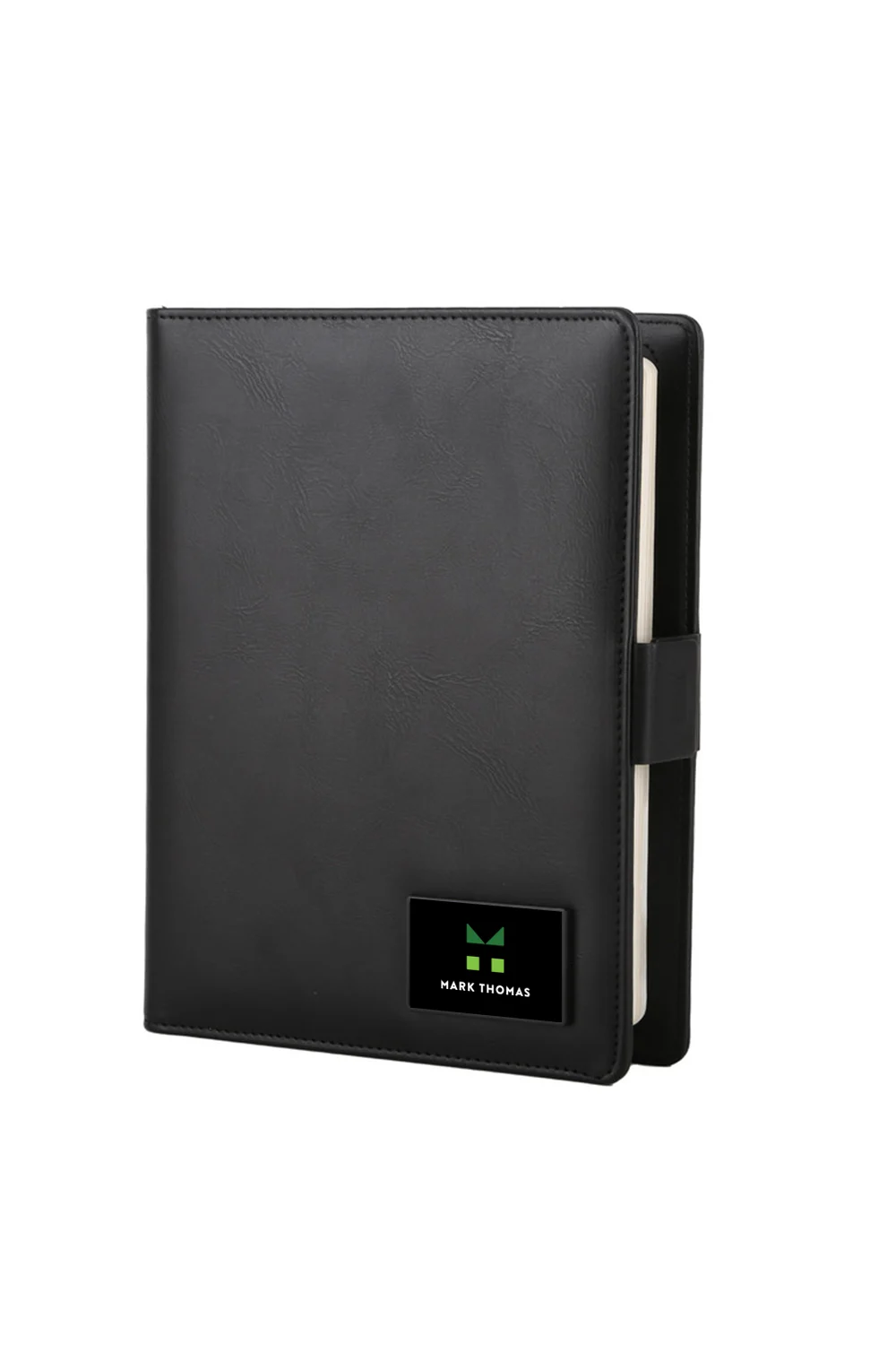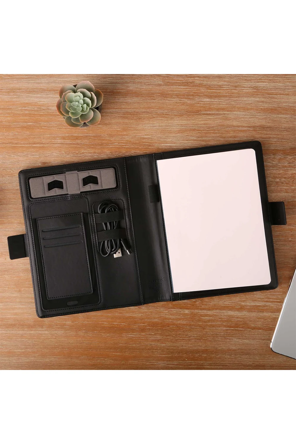 The Charging Portfolio is a 9″ x 7.5″ vegan leather padfolio, perfect for office use, featuring multiple storage pockets, an adjustable phone stand, a bullet journal notebook, and a removable 15W ultra-thin wireless charging powerbank for convenience and productivity.